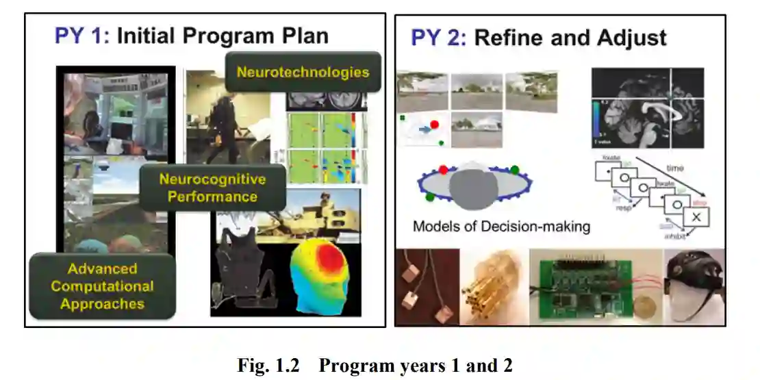 计划第 1 年:CTA 致力于制定合作计划愿景和研究项目,为许多研究想法播下种子,并为未来几年更雄心勃勃的探索奠定基础。在这一阶段,计划确定了之前阐明的愿景和科学障碍。如图 1.2 所示,研究分为三类:神经认知性能、先进计算方法和神经技术。在逼真和逐渐复杂的环境中进行无创神经成像,并配合先进的计算方法来探索数据,是研究的基本主题。