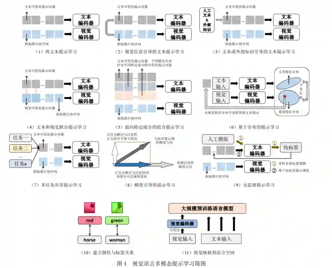 在视觉单模态以及视觉语言多模态领域,“预 训练-微调”范式被广泛采用[16,17],也同样存在计算 成本高、部署复杂等难题.受提示学习高效利用大规 模预训练语言模型的启发,很多学者将提示学习引 入到视觉单模态和视觉语言多模态领域来解决各 类相关下游任务. 目前的视觉单模态提示学习方法包括串接可 优化向量序列[18-20],添加像素级可优化扰动[21-23], 学习提示网络层[24-26],面向特定成分的组合提示学 习[27,28],建立标签映射[29-31],任务重构[31],网络结 构搜索[32]等.这些方法适用的下游任务包括数据均 衡视觉分类[18,21,24,31],持续学习[19,33,34],领域泛化、 适应[20,28,35],细粒度目标检索[36],对抗鲁棒学习[23], 语义分割[37],长尾识别[38],开放集学习[39]等. 在视觉语言多模态领域,提示学习方法包括纯 文本提示学习[40-42],视觉信息引导的文本提示学习 [43,44],文本或外部知识引导的文本提示学习[45,46], 文本和视觉联合提示学习[47,48],面向特定成分的组 合提示学习[49,50],基于分布的提示学习[51,52],多任 务共享的提示学习[53],梯度引导的提示学习[54],无 监督提示学习[55],建立颜色与标签关系[56],视觉映 射到语言空间[57]等.这些视觉语言多模态提示学习 方法被应用于各类下游任务,包括数据均衡视觉分 类[40,43,47,51,53],基础到新类别泛化[45,46,48,52],领域泛 化[40,43,48,58],领域适应[59,60],视觉问答[61,62],图片 描述[63,64],图文检索[65],视觉蕴含[61],视觉推理[66], 多标签分类[67],开放集识别[31,68],去偏差提示学习 [69,70],组合零样本学习[71,72],图像分割[73,74]等. 针对自然语言处理领域中的提示学习方法[6,75] 已经有相关综述[76]展开了全面的介绍.而在视觉相 关领域中,目前只有针对预训练技术的综述[77,78], 而缺少视觉领域提示学习方法的综述.为此,本文对 单模态视觉以及多模态视觉语言领域中的提示学 习方法展开全面介绍.