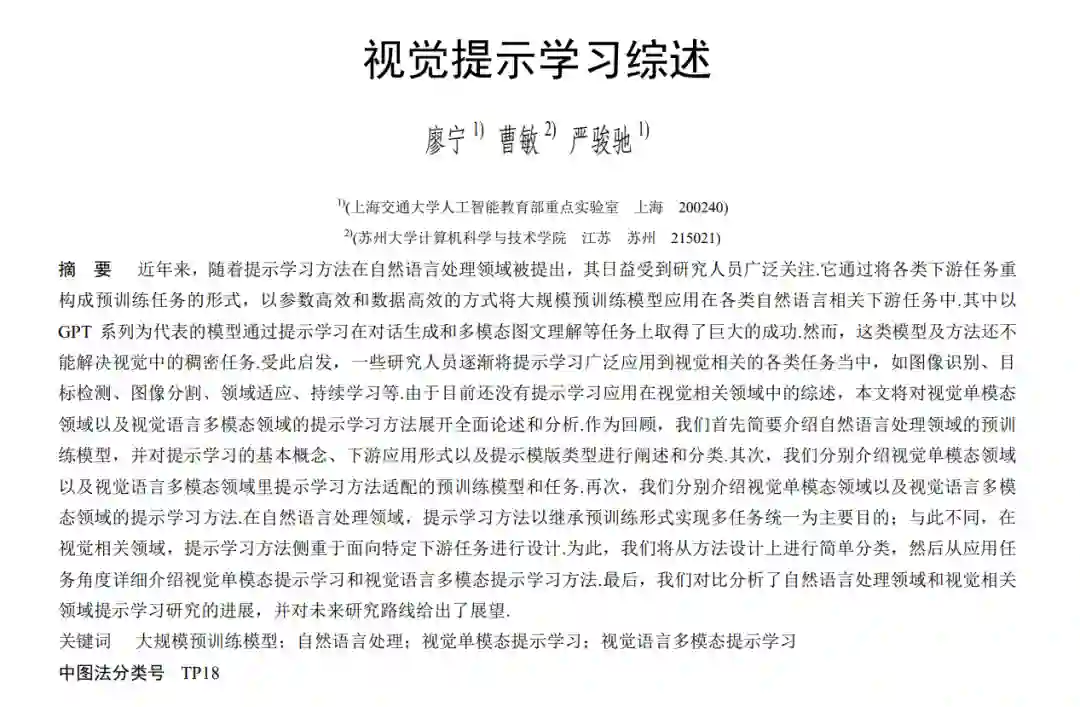 近年来,随着提示学习方法在自然语言处理领域被提出,其日益受到研究人员广泛关注.它通过将各类下游任务重 构成预训练任务的形式,以参数高效和数据高效的方式将大规模预训练模型应用在各类自然语言相关下游任务中.其中以 GPT 系列为代表的模型通过提示学习在对话生成和多模态图文理解等任务上取得了巨大的成功.然而,这类模型及方法还不 能解决视觉中的稠密任务.受此启发,一些研究人员逐渐将提示学习广泛应用到视觉相关的各类任务当中,如图像识别、目 标检测、图像分割、领域适应、持续学习等.由于目前还没有提示学习应用在视觉相关领域中的综述,本文将对视觉单模态 领域以及视觉语言多模态领域的提示学习方法展开全面论述和分析.作为回顾,我们首先简要介绍自然语言处理领域的预训 练模型,并对提示学习的基本概念、下游应用形式以及提示模版类型进行阐述和分类.其次,我们分别介绍视觉单模态领域 以及视觉语言多模态领域里提示学习方法适配的预训练模型和任务.再次,我们分别介绍视觉单模态领域以及视觉语言多模 态领域的提示学习方法.在自然语言处理领域,提示学习方法以继承预训练形式实现多任务统一为主要目的;与此不同,在 视觉相关领域,提示学习方法侧重于面向特定下游任务进行设计.为此,我们将从方法设计上进行简单分类,然后从应用任 务角度详细介绍视觉单模态提示学习和视觉语言多模态提示学习方法.最后,我们对比分析了自然语言处理领域和视觉相关 领域提示学习研究的进展,并对未来研究路线给出了展望。