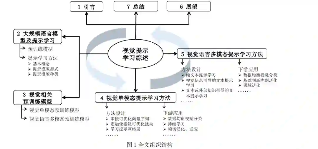 我们将首先介绍自然语言处理领域的预训练 模型和提示学习方法[6,75]的基本概念,并且结合大 规模预训练语言模型的预训练任务简要介绍提示 学习的应用形式和模版类型.其次,我们将分别介绍 视觉单模态与视觉语言多模态领域里的预训练模 型.再次,我们将针对提示学习在各类下游任务上的 广泛应用,分别详细介绍视觉单模态以及视觉语言多模态领域中针对各类应用任务提示学习方法的 设计以及特点的分析.最后,我们给出在未来研究中 视觉和多模态提示学习方法发展的方向,并总结全 文.全文组织结构如图 1 所示.