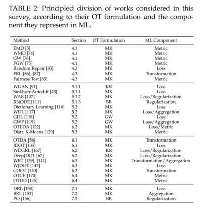 在介绍OT在ML方面的最新贡献之前,我们简要回顾了与相关主题有关的先前综述。关于OT作为数学领域,有大量的文献可供参考。例如,[12]和[13]从连续的角度介绍OT理论。该领域最完整的文本仍然是[3],但它远非入门文本。正如我们在本调查中介绍的,OT为ML做出的贡献在本质上是计算性的。在这个意义上,从业者将专注于离散公式和如何实施OT的计算方面。这是[9]和[10]这两篇调查的情况。虽然[9]作为OT及其离散公式的介绍,[10]则提供了更广泛的视角,介绍了OT的计算方法以及它如何广泛应用于数据科学。在OT为ML方面,我们将我们的工作与[7]和[11]进行比较。前者介绍了OT的理论,并简要讨论了OT在信号处理和ML(如图像去噪)中的应用。后者提供了OT为ML贡献的广泛领域的概述,按数据的结构分类(即,直方图,经验分布,图表)。