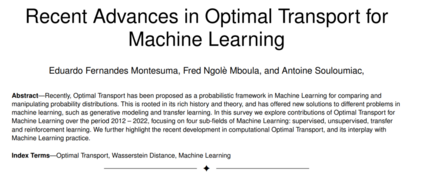 最近,最优传输被提出作为机器学习中用于比较和操纵概率分布的概率框架。这植根于其丰富的历史和理论,并为机器学习中的不同问题提供了新的解决方案,如生成建模和迁移学习。在这篇综述中,我们探讨了2012年至2022年期间最优传输在机器学习方面的贡献,重点关注机器学习的四个子领域:监督学习,无监督学习,迁移学习和强化学习。我们进一步强调了计算最优传输的最近发展,以及它与机器学习实践之间的相互作用。