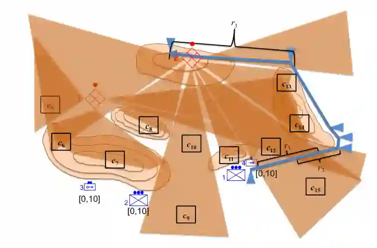 图1. 友军单位1的任务是遵循一条由六个节点组成的路线,用三角形标记。敌方单位1(菱形符号)可以在风险段r2期间损害友方单位1。敌方单位2在r1和r3期间可以损害它。[0,10]标记表示火力支援资源的可用间隔,标有ci的方框是可能的火力支援地点。两者都将在下文中描述。