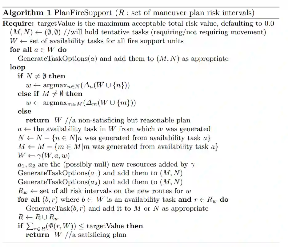 我们提供以下贪心算法来生成一个火力支援计划。当然,鉴于上述优化和满足的解释,它既不是最优的也不是完整的,但它可以有效地产生一个合理的计划。