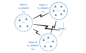 图1. 一个具有同时或连续行动、完全或不完全信息、对称或不对称信息的对抗博弈的一般框架,其中三角形表示玩家,存在m个团队,在团队内部,团队成员以合作方式进行博弈,而团队之间的博弈是对抗性的,通常是零和,即 为所有策略,下标ij代表第i队中的第j个玩家,其策略和效用函数分别表示为