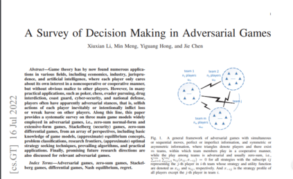 由于竞争特征在大量现实世界的应用中无处不在,直到现在,对抗性博弈已经得到了广泛的研究[13]-[18]。例如,作者在[13]中对2018年Stackelberg安全博弈(SSG)的技术进展进行了广泛的调查,作者在[14]中回顾了一些主要的基于反事实后悔最小化(CFR)方法的不完美信息的广泛形式博弈的纳什均衡(NE)计算算法。作者在[15]中回顾了博弈论和优化算法的结合使用,并对该领域的研究进行了新的分类,作者在[16]中回顾了分布式在线优化,从隐私保护机制角度的联合优化,以及从两个方面的合作/非合作游戏,即, 作者在[17]中从问题分类、性能指标、最先进的性能结果和未来潜在的研究方向的角度,调查了分布式在线学习的最新进展,包括分布式在线优化和在线游戏。此外,考虑到博弈论在国防中的重要性,[18]、[19]对博弈论在国防中的应用进行了一些回顾,[20]对基于博弈论和机器学习(ML)方法的防御性欺骗进行了调查。尽管如此,仍然缺乏从基本模型知识、均衡概念、最优策略寻求技术、研究前沿和流行算法等角度对对抗性博弈的彻底概述。