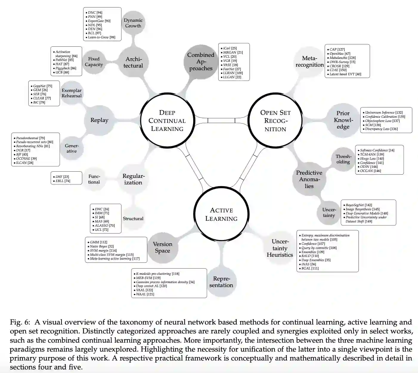 在这项工作中,我们第一次努力建立一个原则性和巩固的深度持续学习、主动学习和在开放的世界中学习的观点。我们首先单独回顾每一个主题,然后继续找出在现代深度学习中似乎较少受到关注的以前学到的教训。我们将继续争论,这些看似独立的主题不仅从另一个角度受益,而且应该结合起来看待。在这个意义上,我们建议将当前的持续学习实践扩展到一个更广泛的视角,将持续学习作为一个总括性术语,自然地包含并建立在先前的主动学习和开放集识别工作之上。本文的主要目的并不是引入新的技术或提倡一种特定的方法作为通用的解决方案,而是对最近提出的神经网络[39]和[40]中基于变分贝叶斯推理的方法进行了改进和扩展,以说明一种走向全面框架的可能选择。重要的是,它作为论证的基础,努力阐明生成建模作为深度学习系统关键组成部分的必要性。我们强调了在这篇论文中发展的观点的重要性,通过实证证明,概述了未来研究的含义和有前景的方向。