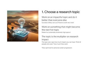 - 普通研究者可能会陷入“兔子洞”——如果他们的实验结果只是普通,他们会花3个多星期撰写并提交到会议。而杰出的研究者在知道某种方法不会取得重大突破时,会迅速转向其他研究。