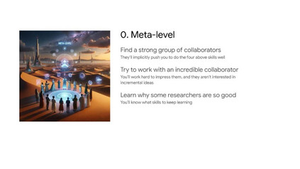 - 如果普通研究者取得了一些成功,他们可能会试图继续做他们觉得舒适的事情,即使这样的方法变得过时。而杰出的研究者能迅速调整,并不断适应新的进展和范式。