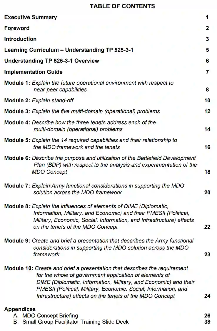 要实现对MDO概念的全面理解,没有任何千篇一律的方法。本学习课程通过对关键问题的积极讨论促进理解。前五个模块涵盖了TP 525-3-1中的基础部分。接下来的三个模块开发知识和技能,以操作MDO概念的组成部分,并使专业人员能够回答有关概念的相关问题。最后两个模块锻炼专业人员的技能,使其能够提出标准的MDO概念简报。