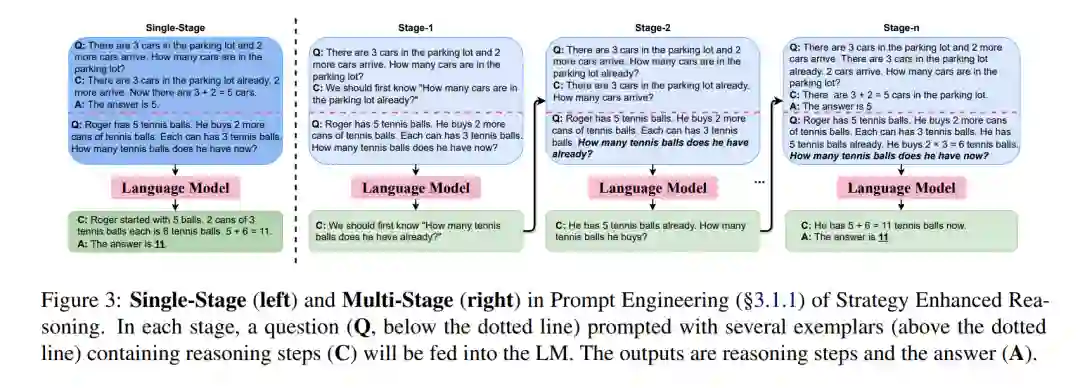 一种改进提示推理的直观方法是提示工程。如图3所示,我们根据提示阶段的数量将这种方法分为单阶段提示和多阶段提示。