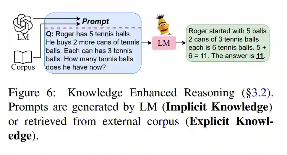 正如Manning(2022)所指出的,知识在AI推理系统中起着至关重要的作用。知识增强方法旨在用隐式(§3.2.1)或显式(§3.2.2)知识提示语言模型,以协助推理(见图6)。