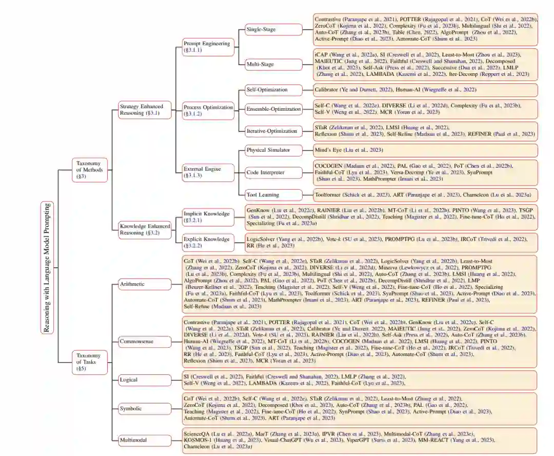 在提示工程(§3.1.1)中,许多方法试图提高提示 T 的质量,我们称这些工作为单阶段方法;而其他方法在每个推理阶段将 ci 添加到(T ,Q)的上下文中,或为每个 ci 设计特定的 Tci ,我们将这些方法视为多阶段方法。需要注意的是,这里的一个阶段是指一个输入输出过程。对于过程优化(§3.1.2),最简单的方法是引入带有参数θ的优化器,用于在生成A时校准C,我们称这些工作为自优化方法。另一些方法尝试获得多个过程来得到最终的答案组合,我们将这些工作视为集成优化方法。此外,整个优化过程可以通过对生成的三元组(Q,C,A)进行微调 pLM 迭代地集成,这被视为迭代优化方法。此外,一些工作利用外部推理引擎(§3.1.3)生成 T ,直接执行 C 或通过在 C 中植入工具 API 调用进行推理。研究的第二个分支重点关注提示的知识增强。需要注意的是,LM 中丰富的隐式“模型知识”(Han等人,2021)可以生成知识或基于知识的提示 T(§3.2.1)。同时,外部资源中的显式知识也可以被利用并检索为知识性提示,以增强推理 (§3.2.2)。