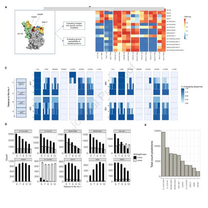 图6 确定抗体对合成RBD变体和突变谱系的鲁棒性。(A)组合文库RBM-2的Omicron (BA.1)突变。(B)在Omicron中观察到的单个和组合突变的结合预测。(C)沿着Omicron谱系的动态逃逸剖面,从Wu-Hu-1距离1-4的所有突变的逃逸序列百分比。(D) Wu-Hu-1编辑距离为6-10中的每个抗体的ACE2结合RBD的抗体预测。