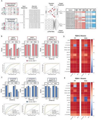 图3 训练和测试基于RBD序列预测ACE2结合和抗体逃逸的机器学习模型和深度学习模型。(A)来自ACE2和单克隆抗体(mAb)选择的深度测序数据经过独热编码,用来训练监督机器学习(RF)和深度学习模型(RNN)。模型根据RBD序列预测ACE2结合或不结合以及mAb结合或逃逸(不结合)的概率(P)来进行分类。(B和C)在2T、2C或Full ACE2或LY-CoV16结合数据上训练的RF和RNN模型的性能,通过精度、F1和ROC曲线显示。低距离序列和高距离序列分别定义为WuHu-1 RBD中≤ED5和≥ED6的序列。(D和E)在RBM-2和RBM-1数据上训练的13个mAb模型的准确性、F1和AUC,在低距离和高距离测试序列上进行评估。