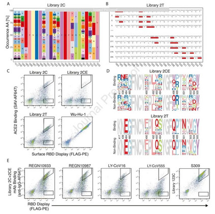 图2 RBD突变文库设计,酵母表面展示筛选及深度测序。(A)显示的是氨基酸在组合文库(文库3C, 1C, 2C)中的使用情况。退化密码子来自于用于ACE2结合的DMS数据 (B) 退化密码子的代表性例子平铺在RBM-2上,它们被汇集在一起组成库2T。(C)流式细胞仪点图显示酵母显示筛选组合(1C、2C、2CE、3C)和平铺RBD文库(1T、2T、3T)和对照RBD (Wu-Hu-1)。(D) RBD的氨基酸标签图是基于ACE2结合和非结合选择的深度测序数据。(E)流式细胞仪点图描绘了酵母展示筛选ACE2结合的RBD库(2C和2CE)的结果。
