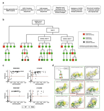 用计算机生成合成谱系可以模拟可信的进化路径,其中排除了每个突变步骤中没有预测到ACE2结合中间体的RBD变体(图4a)。重点分析了RBM-2区域和四种中和抗体(LY-CoV16、LY-CoV555、REGN10933、REGN10987)。当RF和RNN模型均得出P > 0.5时,预测给定的RBD序列与ACE2结合,否则预测它们是非结合剂。选择46个合成谱系变体来体现ACE2结合预测的多样性(图5a)。此外,使用类似的模型方法对合成变体的四种治疗性抗体的逃避进行预测。在完成所有的机器学习预测后,将每个合成的RBD变体分别在酵母细胞表面展示,并评估ACE2结合和抗体逃逸情况。模型对ACE2结合的预测准确率为91.67%,非结合预测准确率为100%,总体预测准确率为93.48% (图4b)。对于33个正确预测的ACE2结合变异,4种治疗性抗体的抗体逃逸预测的综合准确率为93.94% (图4c)。AlphaFold2对8个合成RBD变体进行了结构预测(图4d)。结果表明,几个ACE2非结合变体与原始的Wu-Hu-1 RBD没有本质上的差异。相反,ACE2结合变体出现了广泛的结构构象。