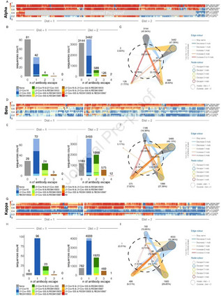 图5 选择RBD变异的低突变距离抗体逃逸的预测分析(A, D和G) 。热力图描绘了单克隆抗体(mAb)结合,通过RF和RNN模型评估Alpha, Beta和Kappa的ED1和ED2变体。(B, E和H)对ED1和ED2转义n个的序列数量(模型间一致,阈值>0.5)。(C, F和I)深度逃逸网络显示了变异及其逃离单克隆抗体之间可能的进化路径。