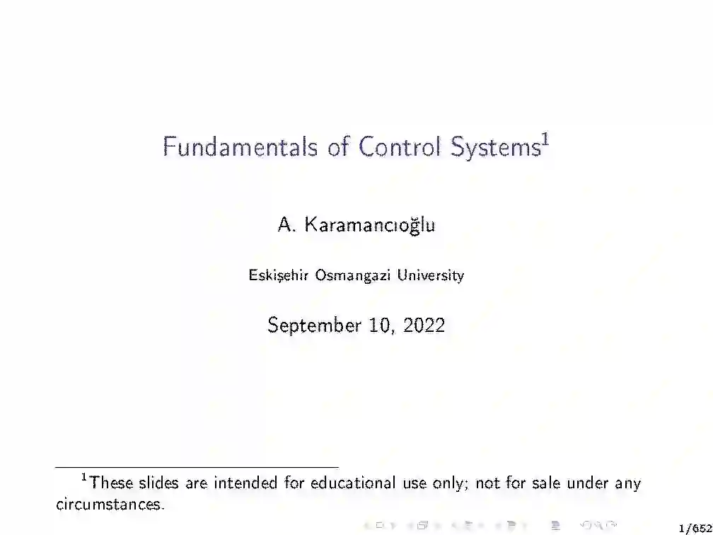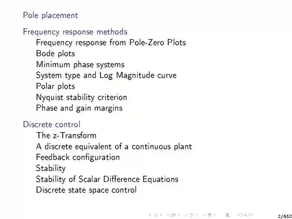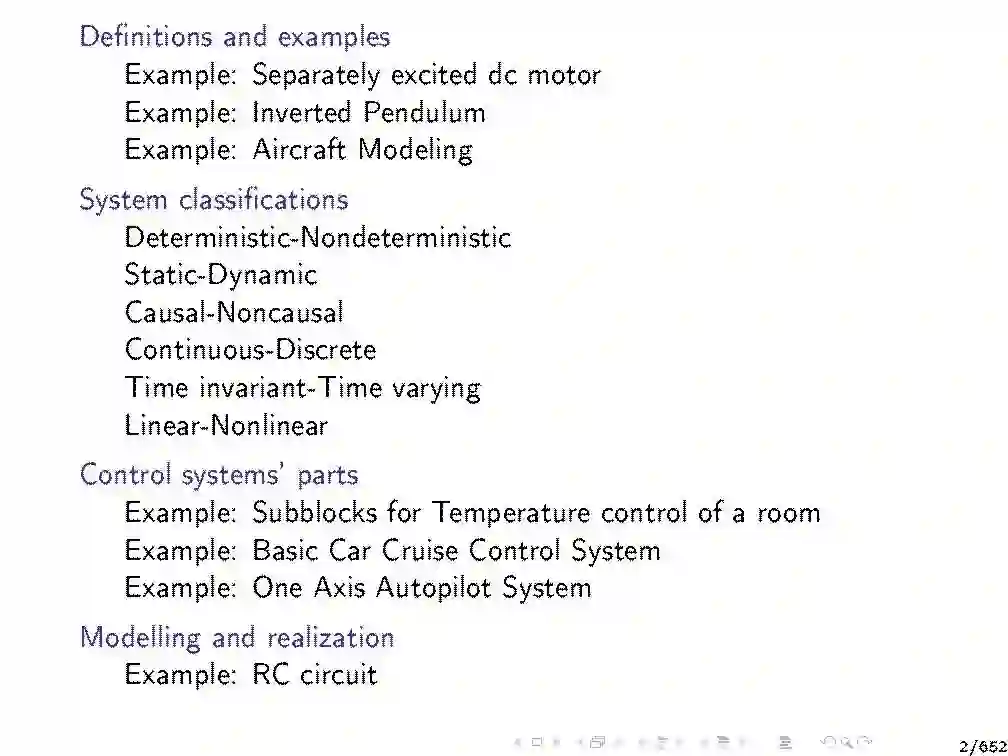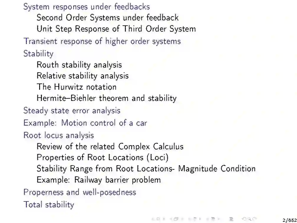 《现代控制系统》采用集成设计和分析方法提出了反馈控制理论的结构。控制系统通常由以下部分组成(这些部分本身就是系统)。设备是一个给定的系统,它的输出要被控制。传感器是测量装置输出的装置。控制器是一种计算设备输入所需值以达到设备输出所需值的系统。执行器是将设备输入值设定为控制器所指示的值的装置。执行器和传感器有时可能是装置或控制器的一部分。如果控制器的输出不显式地依赖于工厂输出的实际值,则该控制系统称为开环控制系统。否则,它被称为闭环或(等价地)反馈控制系统。