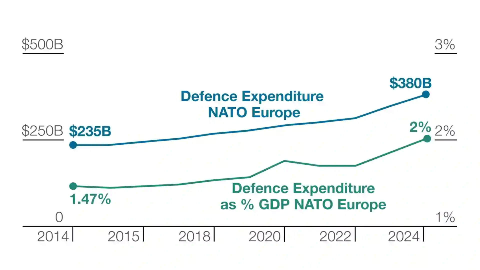 因此,在 2023 年的维尔纽斯峰会上,北约将 2% 的基准设定为盟国必须达到的最低标准--到 2024 年,预计将有 18 个国家达到这一最低标准。最近,北约将这一预期更新为 23 个盟国。今年也将是欧洲国防开支总和达到欧洲国内生产总值 2% 的第一年(见图 3)。2014 年,欧洲国防开支总和仅占 GDP 的 1.47%,总额仅为 2,350 亿美元;2024 年,欧洲的国防开支将达到 3,800 亿美元。