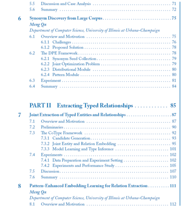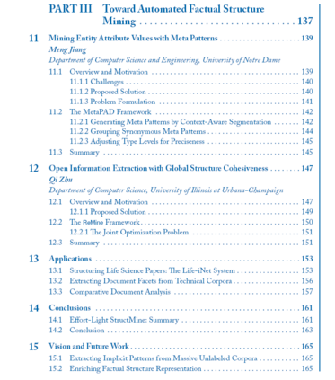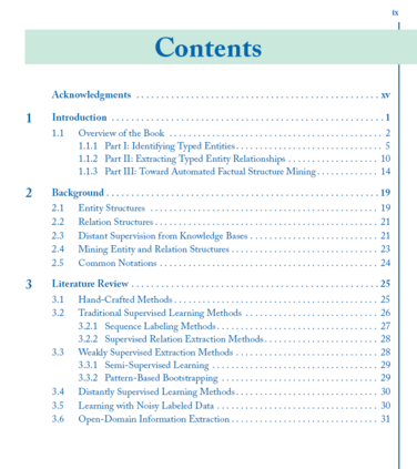 现实世界的数据虽然庞大,但在很大程度上是非结构化的,以自然语言文本的形式存在。从大量的文本数据中挖掘结构,而不需要大量的人工注释和标记,这是一个挑战,但也是非常理想的。在这本书中,我们研究了从大量非结构化文本语料库中挖掘事实知识结构(例如,实体及其关系)的原则和方法。与许多现有的结构提取方法不同,现有的方法严重依赖于人工注释数据进行模型训练,我们的轻工作量方法利用存储在外部知识库中的人工管理事实作为远程监督,并利用大型文本语料库中的丰富数据冗余进行上下文理解。这种轻工作量挖掘方法为构建文本语料库带来了一系列新的原则和强大的方法,包括:(1)实体识别、打字和同义词发现;(2)实体关系抽取;(3)开放域属性值挖掘与信息提取。本书介绍了这一新的研究前沿,并指出了一些有前景的研究方向。