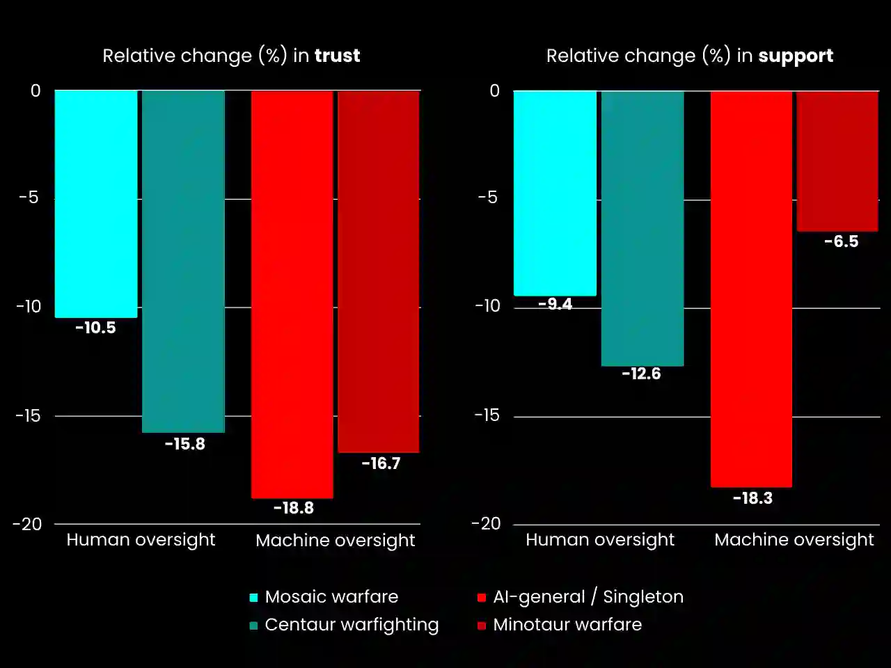 图 1. 与基线组相比,四类人工智能战争的信任度和支持度。注:数值代表与基线组相比,各处理组对人工智能增强型军事技术的支持度和信任度的变化。当支持度和信任度与基线组相比下降时,数值为负。(数据:Paul Lushenko;可视化:François Diaz-Maurin)