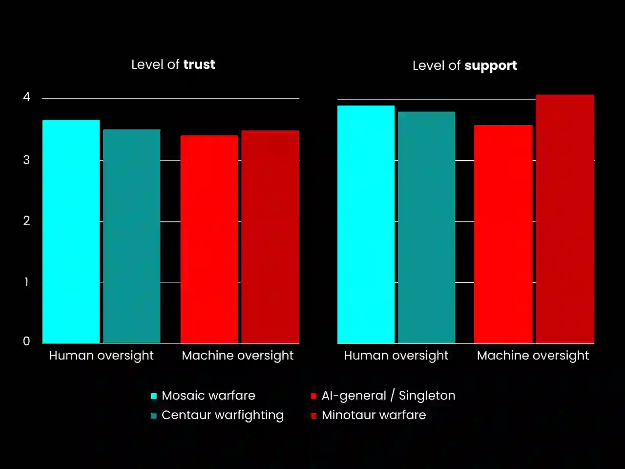 这项调查揭示了几个重要发现。首先,基于对这些新能力的决策水平和监督类型的不同,军官对人工智能增强型军事技术的信任程度也不同。虽然军官们普遍不信任不同类型的人工智能增强型武器,但他们最不信任用于单兵作战(由机器监督的战略决策)的能力。另一方面,他们对马赛克战争(人工智能优化战略决策的人工监督)表现出更多的信任。这表明,军官们始终倾向于由人类控制人工智能来识别敌方活动的细微模式、生成军事方案以应对对手的多重困境,或者在长期冲突中帮助维持战备状态。