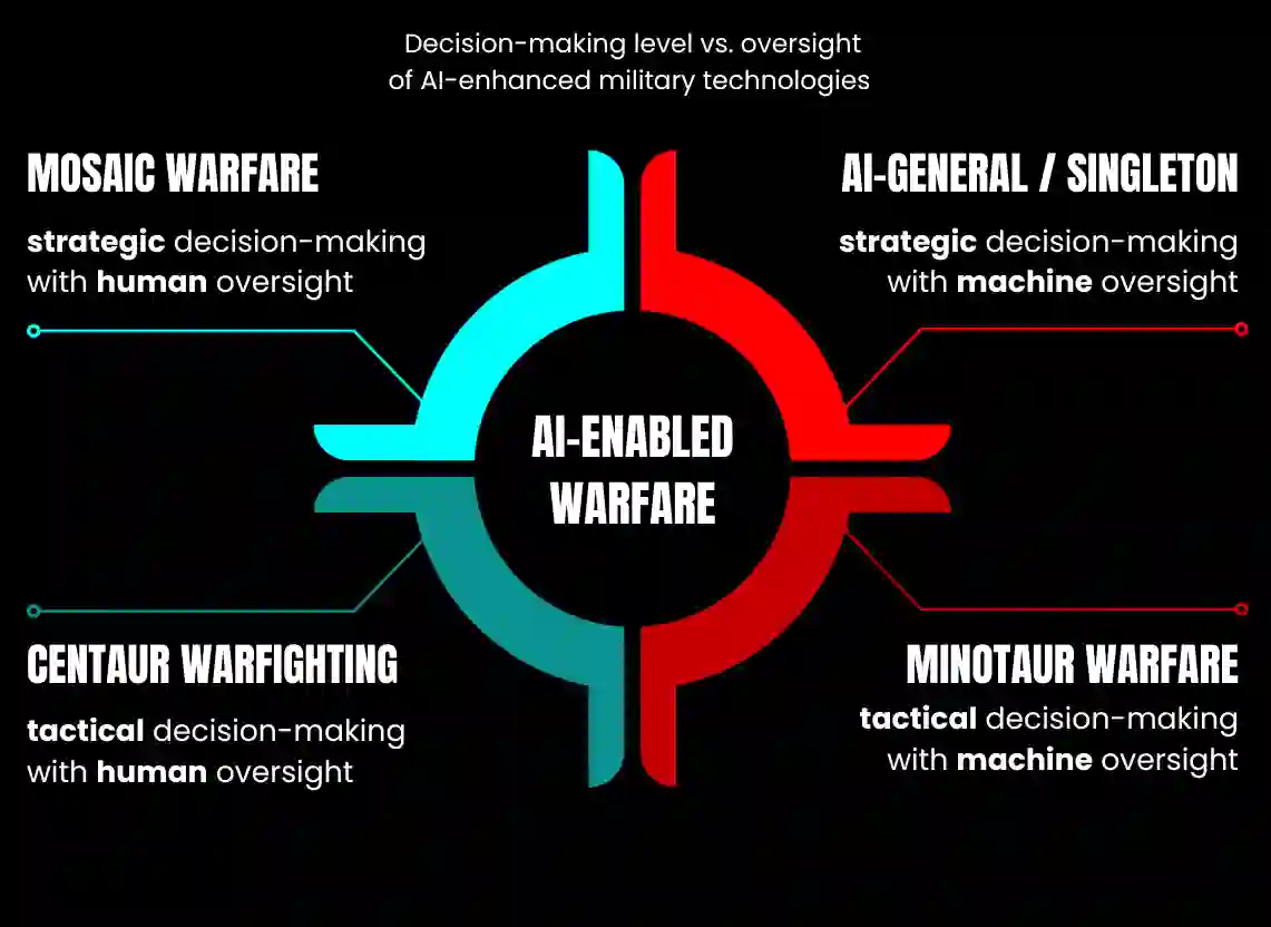 其次,各国可以利用人工智能增强型军事技术,在机器监督下进行战术决策。这就从字面上颠覆了半人马战争,让人联想到古希腊的另一种神话生物--牛头人,它有牛的头和尾巴,人的身体。"牛头人战争 "的特点是在战斗中机器控制人类和跨领域作战,从地面上的士兵巡逻到海洋上的战舰编队,再到空中的战斗机编队,不一而足。
