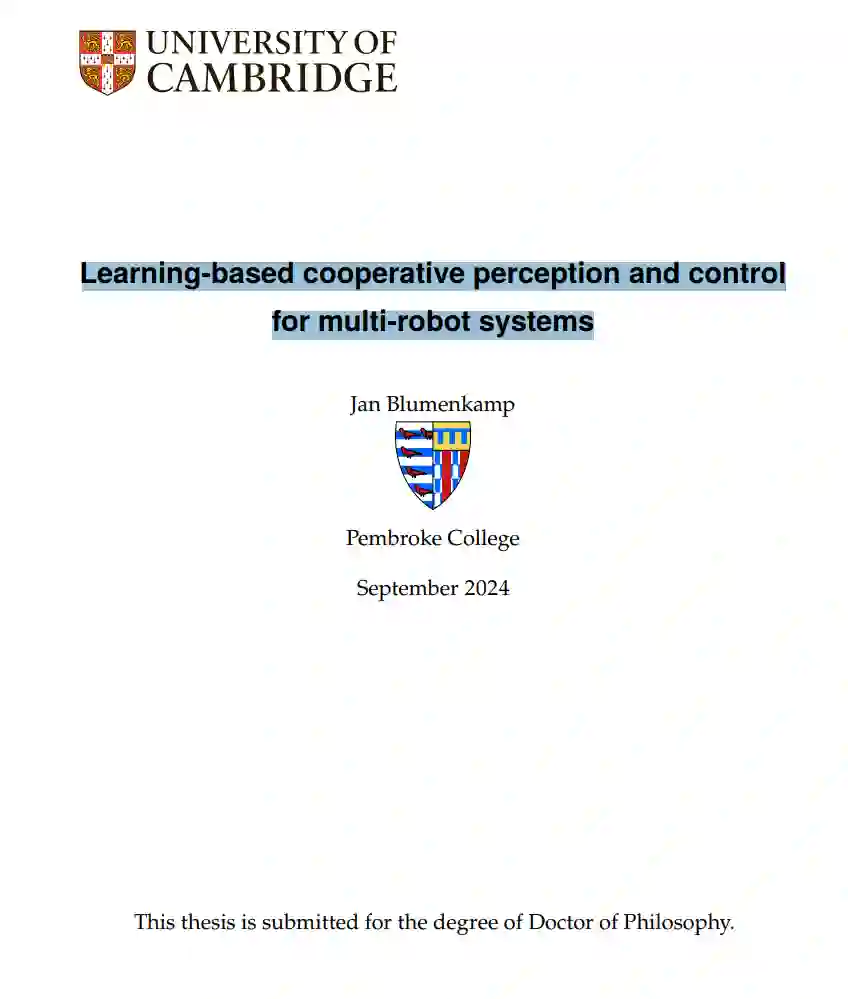 研究贡献本论文提出一系列创新框架,用于去中心化现实MRS的控制与感知策略部署验证:1. 可学习通信的多机协同控制首次通过可微分通信信道结合强化学习(RL),训练支持可学习通信的多机协同策略,并在多种仿真场景验证;构建包含9台敏捷地面机器人的Cambridge RoboMaster实验平台,实证对比集中式与去中心化部署方法,揭示sim-to-real迁移效应。2. 可学习通信的多机协同感知突破依赖外部定位基础设施的全局状态协同范式,探索基于单目相机局部感知的策略训练:开发GNN视觉导航策略,实现无需标定的移动机器人目标引导;融合控制与感知技术,提出多机器人视觉空间基础模型,支持实时去中心化感知与控制。该模型通过单目图像预测相对位姿与局部地图,性能超越需重叠视野与预设网络架构的传统方法;在多机编队控制任务中验证模型有效性,展示室内外场景下的去中心化部署能力。研究意义本论文弥合了MRS理论学习与实际部署的鸿沟,所提方法为构建高效、自适应的现实MRS奠定基础。