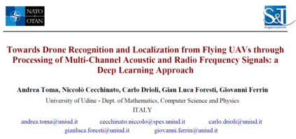 我们解决的问题是检测作为声源的不明无人机的存在,通过处理螺旋桨噪声产生的声学信号在不同的无人机中识别它,并通过估计声学信号的到达方向(DOA)和与无人机的距离对无人机进行定位。我们提出了一个解决方案,其中声学处理得到了射频(RF)传输模式分析的帮助。这样,当声学定位前端检测到来自射频天线组件估计方向的声学活动时,声源定位可以得到完善,并通过波束成形增强记录信号。这是因为,当使用安装在多旋翼无人机(UAV)上的小尺寸麦克风阵列进行声学记录时,如[1,2,3],由于对麦克风阵列尺寸的限制,可能导致信号-噪声增强不佳、空间分辨率低和空间信息不完整等问题,对感兴趣的声源的处理和信号增强变得特别具有挑战性。为了解决这些限制,最近在[4,5]中介绍了一种新的基于射频的声源定位处理方法,该方法也能进行距离估计,但没有引入识别能力。因此,我们现在研究射频辅助算法的性能,该算法也能识别未识别的空中声源。我们的算法可以应用于针对非法使用无人机和外部无人机攻击的反无人机监测策略[6,7],即使是在敌对环境中。