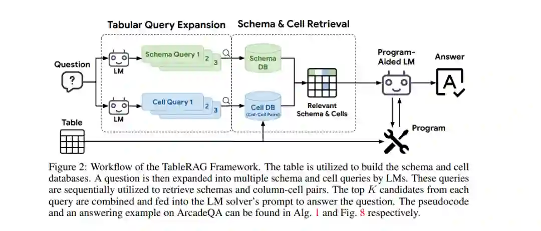 随着语言模型(LM)在处理表格数据能力方面的显著进步,尤其是通过程序辅助机制来操控和分析表格数据,其推理能力得到了显著提升。然而,这些方法通常需要将整个表格作为输入,这导致了由于位置偏差或上下文长度限制而产生的可扩展性问题。为应对这些挑战,我们引入了 TableRAG,这是一个专门设计用于基于LM的表格理解的检索增强生成(Retrieval-Augmented Generation, RAG)框架。TableRAG 利用查询扩展结合模式和单元检索,以在提供给语言模型之前精确定位关键信息。这种方法实现了更高效的数据编码和精准的检索,显著缩短了提示长度并减轻了信息损失。