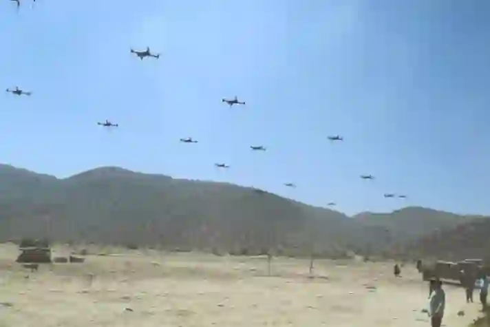 图:2019年5月8日,在加利福尼亚州欧文堡的国家训练中心,由威胁系统管理办公室提供的40架无人机群在一次演习中起飞,以支持第11装甲骑兵团。美国陆军