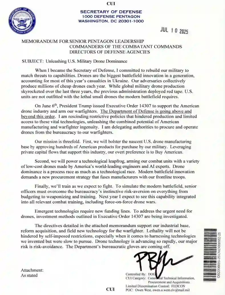 此外:"各军种将设立直属无人机项目办公室(聚焦小型无人机),60日内完成全面审查'识别可被无人机替代的成本效益/杀伤力更高项目'。"