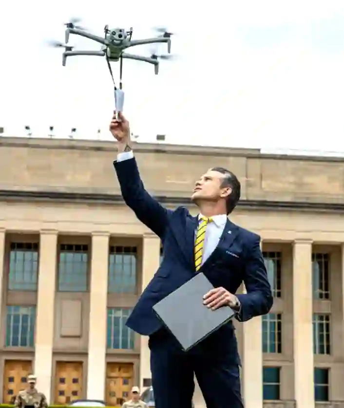 图:一架第一组无人机在五角大楼前向国防部长皮特·海格塞斯递送了一份五角大楼新的无人机政策备忘录。