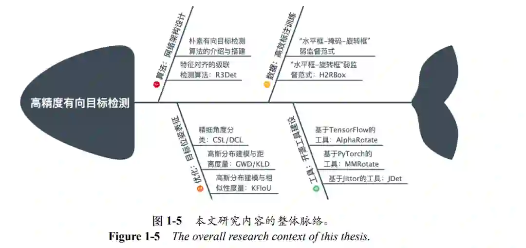 本论文旨在研究复杂场景下高精度的有向目标检测算法。有向目标检测是 通用水平目标检测的一个扩展研究方向,其主要特点是可以更精准地定位目标, 并擅长完成包含大量密集排列、大长宽比、方向任意目标的复杂场景的检测任 务。大量文献表明,有向目标检测不仅在计算机视觉领域中有着重要的学术研 究价值,在国防建设、科学技术、医学治疗、食品健康、工业发展、环境保护、 农业养殖、公共安全、文化传播等领域也具有广阔的应用价值。 受益于通用水平目标检测在深度学习时代的蓬勃发展,有向目标检测器可 以很轻松地基于先进的水平检测算法进行实现。但是,有向目标检测的研究常常 需要面对一些独特的问题挑战,如不同定义法下由边界不连续造成的损失陡增、 类正方目标导致的表示歧义等。如何更加高效地实现高精度有向目标检测已成 为当下的研究热点。本论文以有向目标检测为研究重点,在鲁棒有向目标检测 器搭建、高效位姿参数估计、弱监督算法探索以及有向目标检测工具设计这四个 方面来扩展和完善现有的算法。论文的主要贡献包含以下几方面: