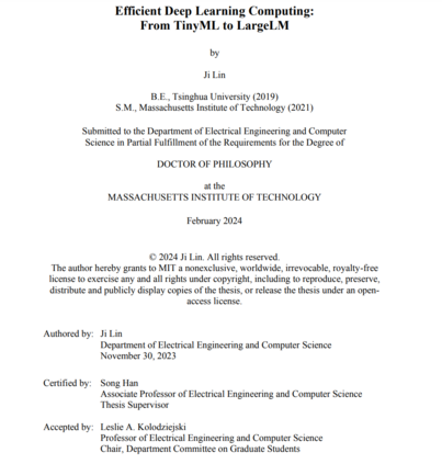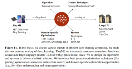 在这篇论文中,我们想要通过消除冗余来解决深度学习的效率瓶颈。我们研究了两个极端的缩放:微型机器学习(TinyML)和大型语言模型(LLMs)(图1-1)。TinyML旨在在具有紧密内存限制(例如,256KB)的低功耗IoT设备上运行深度学习模型,而LLMs拥有超过1000亿参数,已超出最强大GPU的容量。尽管两者之间的差距超过了6个数量级,我们发现它们实际上面临着相同的根本瓶颈,即深度学习模型超出了硬件容量。我们开发了高效的深度学习算法和系统来帮助弥合这一差距。