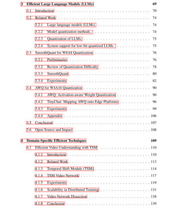 在这篇论文中,我们将讨论提高深度学习效率的技术,通过消除冗余。我们研究了在缩放的两个极端——微型机器学习(TinyML)和大型语言模型(LLMs)——进行高效深度学习计算。TinyML旨在在具有紧密内存限制的低功耗IoT设备上运行深度学习模型。我们探索了系统-算法共设计方法来消除冗余的内存使用,并在商用微控制器上实现实际应用,首次实现了ImageNet 70%的精度里程碑。我们进一步将解决方案从推理扩展到训练,并在仅有256KB内存的情况下启用设备上学习。与TinyML类似,LLMs的巨大模型尺寸也超出了即使是最先进GPU的硬件能力。我们开发了针对不同服务工作负载的训练后量化方案,以减少权重和激活的冗余位,实现了W8A8量化(SmoothQuant)用于计算受限推理和W4A16量化(AWQ)用于内存受限。我们进一步开发了TinyChat,一个高效且原生支持Python的服务系统,以实现来自量化的加速。最后,我们将讨论一些特定领域的优化机会,包括使用时间位移模块(TSM)的高效视频识别和使用Anycost GANs的图像生成,我们通过专门的模型设计减少了特定应用的冗余。