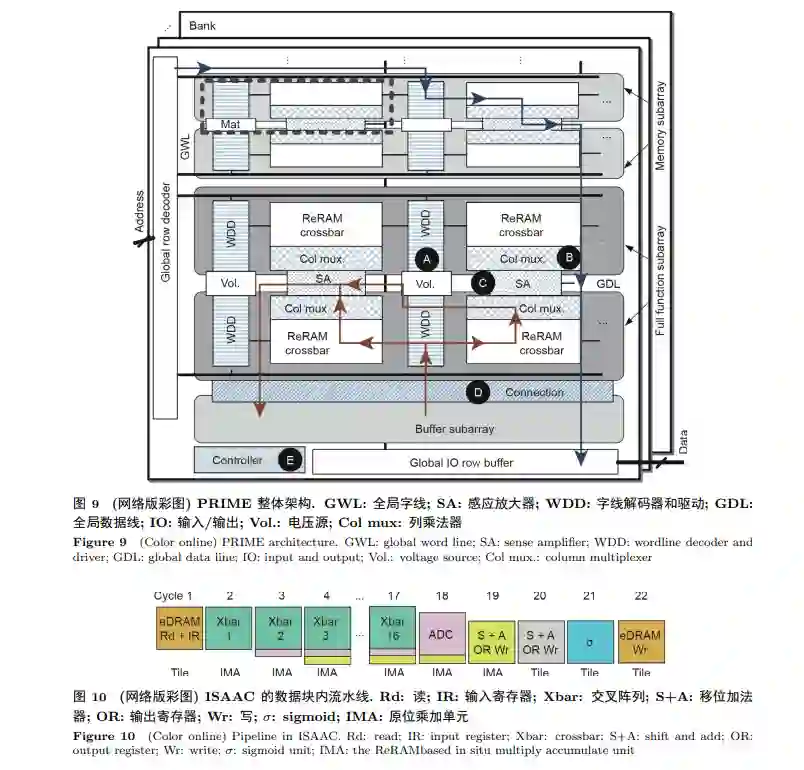 利用ReRAM进行DNN加速的主要思路是利用ReRAM阵列进行“原位"的MVM计算. PRIME [7], ISAAC [11]以及PipeLayer [8]是3个具有代表性的基于ReRAM的DNN加速器. PRIME的架构如图 9 所示. PRIME利用ReRAM同时对数据进行存储和计算. 在PRIME中, WDD可以根据输入的大小配置相应的电压. Col mux可以配置为模拟域减法和非线性激活函数电路(sigmoid). 两个不同ReRAM阵列的中间结果可以合并在一起然后发送到sigmoid 电路上进行下一步计算. PRIME中SA的精度也可以按照需求进行配置, 并且像ADC一样进行模拟信号到数字信号的转换. ISAAC [11]提出了一个数据块内流水线式的NN处理架构. 如图 10 所示, 这条流水线中结合了数据的编码与计算. IMA是基于ReRAM的原位乘加单元. 第一个周期, 数据先从eDRAM中被取出然后发送到计算单元. ISAAC中的数据格式是16比特定点数. 在计算过程中, 每一个周期都有1比特数据被发送到IMA中. IMA的结果被转换成数字信号形式存储. 针对一个数据的16个计算周期, 之前的结果不断移位与当前结果相加, 从而得到最终结果. 然后, 线性的最终结果被非线性函数计算电路处理, 最后写入eDRAM. PipeLayer [8]也采用了流水线的工作方式. 与ISAAC不同, PipeLayer每次处理的数据“粒度"更大, 以此来充分利用ReRAM计算单元的高并行性. PipeLayer也提出了两种并行计算的方式: 层内并行与层间并行. 对于层内并行, PipeLayer采用了一种数据并行的处理方式, 即用多个含有相同权重的处理单元去处理更多的输入数据; 而层间并行则采用模型并行的处理方式, 即含有模型不同层权重的处理单元同时运行. 中间结果被一直复用. 注意, 这时不同的处理单元同时得到的是来自不同输入的中间结果.