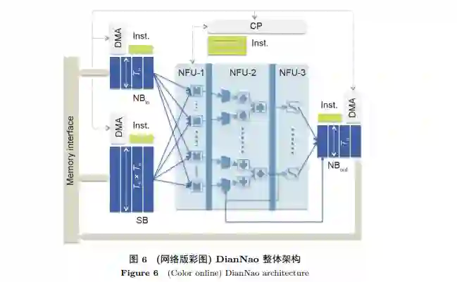 如表 tab1所示, DianNao系列有多个加速器. DianNao是这个系列的首款加速器. 如图 6所示, DianNao由以下部分组成: (1)由神经计算单元组成的计算模块(neural functional unit, NFU); (2)一个输入缓存( N B i n ); (3)一个输出缓存( N B o u t ); (4)一个突触权重缓存(synapse buffer, SB); (5) 一个控制处理器(control processor, CP). NFU是进行乘加操作以及非线性运算的基本单元, 并且采用流水线的方式进行计算. NFU没有采用传统的片上缓存, 而是用片上便签存储器(scratchpad memory)作为片上的数据存储. 与传统缓存相比, scratchpad可以被编译器控制并且更有利于通过编译控制来提高数据的局部性, 从而更好地进行数据重用. 尽管高性能的计算单元对于DNN加速器非常重要, 低效的缓存也可以很大程度地影响系统的能效及吞吐率. DianNao系列加速器提出了一种针对减小访存延时的特殊设计. 例如针对数据中心应用场景所设计的DaDianNao [16]在片上集成了大量嵌入式动态随机存取存储器(embedded dynamic random access memory, eDRAM)来尽可能避免对片外主存的读取. 同样的思路也适用于针对面向嵌入式场景的ShiDianNao [17]. ShiDianNao主要用来加速CNN. 由于CNN计算中存在大量的数据重用, 因而加速CNN所需的数据读取次数相对更少. 这就使得当CNN模型参数量小时, 我们就可以把CNN的权重全都存储到片上静态随机存取存储器(static random access memory, SRAM)上. 在这种情况下, 与DianNao对比, ShiDianNao避免了大量高延迟高能耗的片外访存, 并且可以将能效提高60倍. PuDianNao [18]是一个面向多种ML应用的加速器设计. 除了支持DNN的加速计算外, 它还支持像k均值(k-means)和分类树(claasification tree)这样的其他ML算法. 为了同时支持这些应用的不同数据访存模式, PuDianNao提出了“冷缓存" (cold buffer)和“热缓存" (hot buffer)来应对不同的数据重用方式. 除此之外, 一些如循环展开(loop unrolling)和循环分块(loop tiling)等编译技术也被应用, 从而形成一个软硬件协同设计的方法来增加片上数据的重用以及PE的实际利用率.