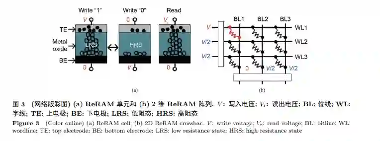 ReRAM是一种用电阻单元来存储数据信息的新型非易失性存储器件. 如图 3(a)所示, 每一个ReRAM单元都在上下电极之间有一个金属氧化物夹层. 这个单元的电阻值可以通过写入电流或者电压而设定. 写入电流的脉冲宽度及电压的大小决定了所要设定的电阻值的大小. 当读出数据信息时, 只需要在此器件上加一个小的感应电压, 输出电流的大小反应了电阻值的大小, 进而可获 得所存储的数据信息. 除此之外, 由许多ReRAM单元组成的ReRAM阵列可以进行原位的MVM计算. 这可以应用到加速NN的MVM计算上. 如图 3(b)所示, 输入向量作为输入信号以电压的形式加到字线上. 而矩阵的每一个元素作为电导值则被预先写入ReRAM阵列中. 每一个位线的累积电流则可以看成是两个向量内积的结果. 因而一个阵列的所有输出则可看成是一个MVM的结果. MVM的输出作为中间结果会被进一步处理从而得到最终结果.