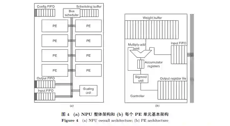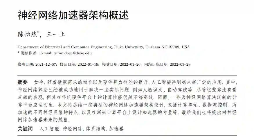 其实神经网络加速硬件单元最早作为通用处理器的辅助单元 [13], 加速被NN替代的某些通用程序中的“近似程序段"(approximate program), 从而实现加速通用程序处理的目的. 注意, 这里的近似程序段是指可以通过训练一个NN模型模仿其行为并且被NN替代后其精度损失可以在接受范围内的程序. 随着NN应用的范围越来越广泛, 其作用也不再仅仅局限于近似计算领域, 专门为NN的计算定制加速硬件也变得更有必要.
