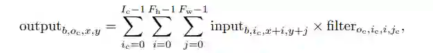 其中 i c 是输入通道的标号, o c 是输出通道的标号( 0 ≤ o c < O c ), b 是批量输入样本中的标号( 0 ≤ b < B ). 在这个矩阵向量乘法中每一个输入可以被所有的输出通道重用, 而每一个权重则可以被所有批量输入重用.