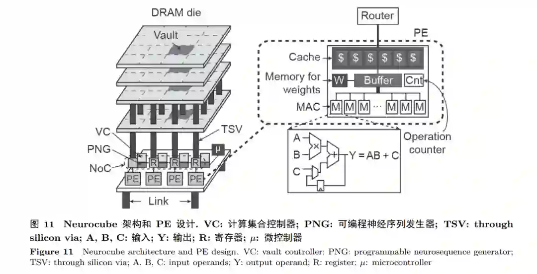 HMC将几个DRAM的存储芯片和逻辑层芯片竖直集成在一起. 这个集成体被划分为多个相对独立的“计算集合" (vault). HMC大存储量、高带宽、 低延迟的特点使得近存计算成为可能. 在一个基于HMC的加速器架构设计中, 计算和逻辑单元被放在逻辑层芯片上, DRAM的存储芯片则用来储存数据. Neurocube [20]和Tetris [21]是两个典型的基于HMC的DNN加速器. 如图11所示, Neurocube包含16个vault. 每个vault可以被看成一个子系统. 这个子系统包含一个可以做乘加的PE和一个负责数据包 在逻辑层芯片与DRAM存储芯片之间传输的数据通路. 每个vault也可以通过数据通路与其 他vault进行乱序数据发送与接收. 基于新型存储器件的加速器有效减少了数据的搬运, 并且尤其适合处理数据量/参数量较大的计算任务, 不再受“冯 ⋅ 诺依曼"架构的限制, 是未来加速器架构发展的重要方向.