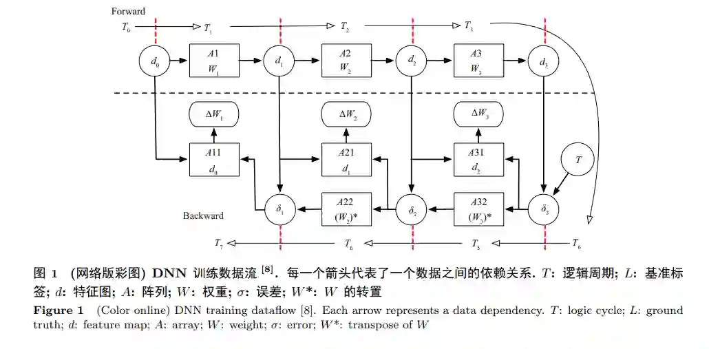 其中 x 为DNN的输入. 由此例可知, 每一层的输出其实只作为下一层的输入, 因而整个DNN的推理过程可以看作是一个链式计算的过程. 在DNN的训练中, 数据的前向传播过程和推理一致, 但其反向传播过程与之相反. 并且前向传播过程中每一层的中间结果都会在反向传播过程中被重新利用来计算误差(这是由于反向传播的链式法则). 这无疑大大加剧了数据之间的依赖性. 图 1 表明了训练与推理过程中的区别. 一个DNN也可能会包含卷积层(convolutional layer), 全连接层(fully connected layer)以及一些其他非线性层(如激活函数ReLU, sigmoid, 池化层(max pooling)以及批标准化层(batch normalization)). 在反向传播过程中, 矩阵乘法以及卷积仍然基本保持其计算模式不变. 细节上的区别是在反向传播过程中, 原来的权重矩阵以转置的形式参与反向传播计算, 而卷积核也以旋转的形式参与梯度下降的计算.
