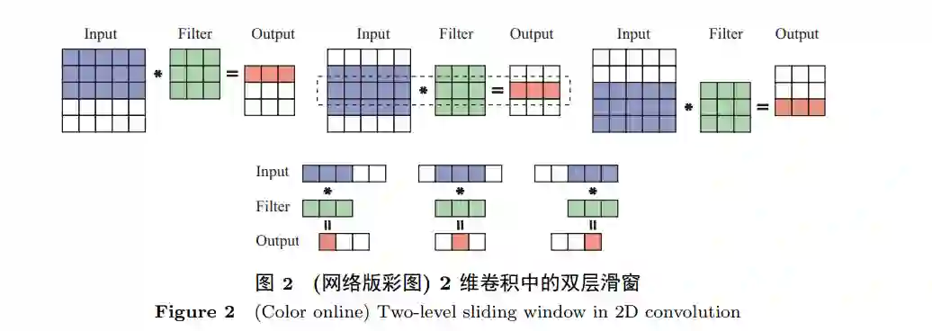 DNN中的卷积实际上可以被看成是矩阵乘法的扩展. 卷积的作用从直观上来讲可以说是增加数据的局部联系性. 与一般的矩阵乘法相比, 在卷积计算中, 每一个输入元素被一张2维特征图所替代, 每一个权重元素被一个2维卷积核(convolution kernel/filter)替代. 其计算模式是一种“滑窗"式计算. 如图 2所示, 卷积核从输入特征图的左上角开始滑向右下角. 这个过程可以表示为