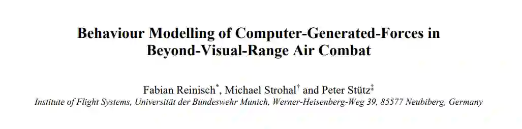 在现代空战中,超视距(BVR)交战越来越频繁。飞行员面临的主要挑战之一是机动计划,这反映了他们的决策能力,并能决定成败。为确保采用虚拟BVR空战模拟的飞行员训练取得成功,计算机生成部队(CGF)的高精度水平至关重要。要实现这一目标,不仅要充分复制和模拟实体的物理特性,还要使其具有接近人类的行为。在本文中,我们提出了应对这些挑战的总体概念: 首先,我们引入飞行运动动态模型(飞机、导弹、箔条)以及干扰器。然后,我们分析典型的超视距空战的工作流程,将其分为攻击、自卫和决定。在此背景下,我们引入行为树作为这些任务的建模方法,并解释其优点。进一步的计划包括在未来由人类控制的对手飞机(飞行员)与CGF对飞的实验活动中验证和确认CGF的行为。最后,我们对未来的工作进行了展望,我们打算在包含多个自由度的任务中采用强化学习。