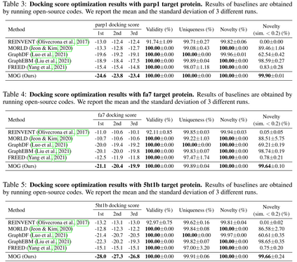 结论: 与基线相比,MOG可以生成具有更高对接分数的分子,同时实现近乎完美的有效性、唯一性和新颖性。上述结果表明,通过能量中心与属性网络结合修改的朗之万动力学方程可以极大地促进了寻找最优解,避免局部最优,从而获得了更高的对接分数。