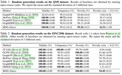 结论: (1)MOG与GraphEBM的模型结构相同,但朗之万动力学方程不同。与GraphEBM相比,MOG新颖性的提高可以归结为多个能量中心的作用。总体结果表明能量增强策略更有利于从训练分子中产生不同的分子。
