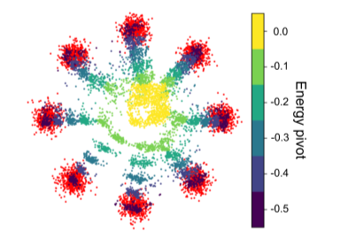 图2 2D示例上的生成。训练分布由8个各向同性高斯斑点组成,红色表示样本。生成的有着特定能量中心的样本由相应的颜色表示。