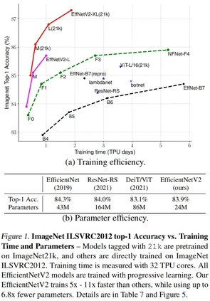 本文提出一种训练速度更快、参数量更少的卷积神经网络EfficientNetV2。我们采用了训练感知NAS与缩放技术对训练速度与参数量进行联合优化,NAS的搜索空间采用了新的op(比如Fused-MBConv)进行扩充。实验表明:相比其他SOTA方案,所提EfficientNetV2收敛速度更快,模型更小(6.8x)。